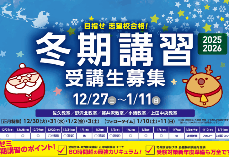 1月112026 ゼミナール 12/27〜1/11 冬期講習[小3〜高3] 12月27日(土)〜1月11日(日)の期間、冬期講習を開催します! 冬休みの間に差をつけましょう! ○詳しくは、ヨダゼミ公式ブログ...