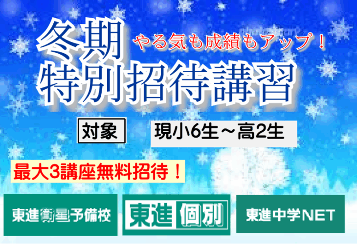 1月072026 ゼミナール 東進・東進中学NET 冬期特別招待講習(無料招待)! ◆東進冬期特別招待講習 東進が誇る先進のシステムと一流講師陣による授業を無料で体感できる冬期特別招待講習。 推薦型選抜、総合型選抜...