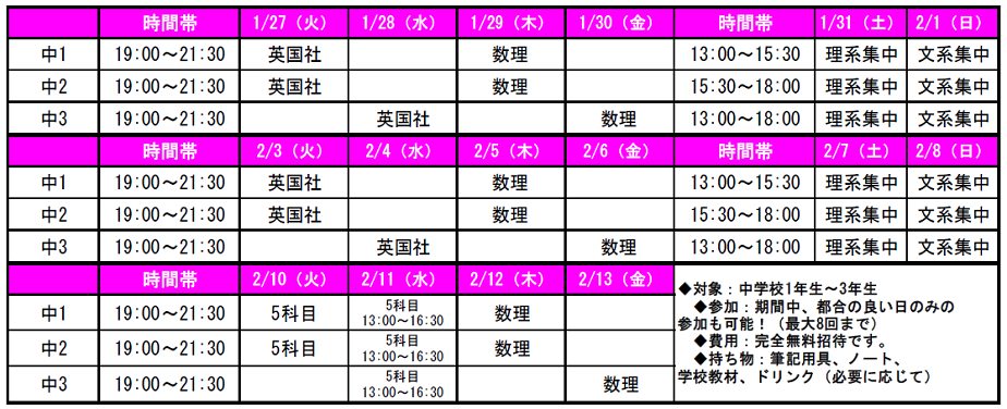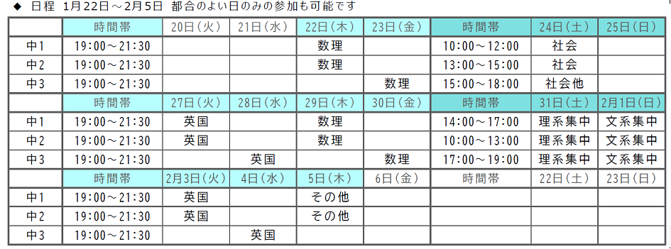 | 中1 | 英・国・社 | 数・理 | 集中対策日 | 集中対策日 | |||
