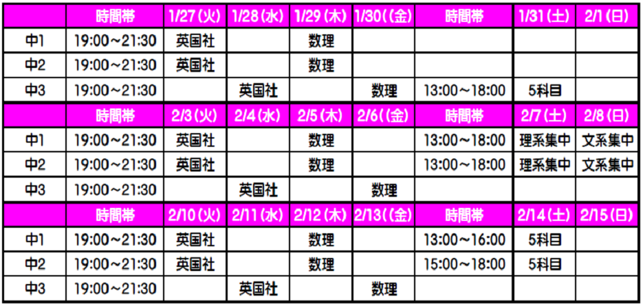 | 中3 | 英・国・社 | 数・理 | 集中対策日 | 集中対策日 |