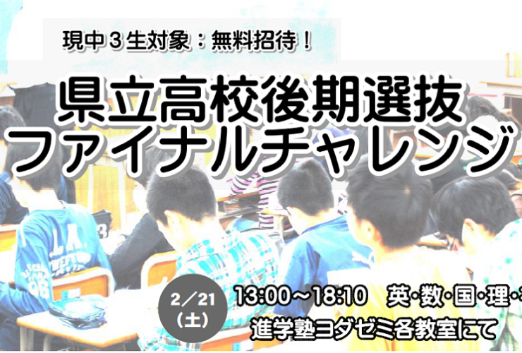 進学塾ヨダゼミでは、毎年2回のビッグイベントとして、外部会場を用意して実施しています。受験料は、通塾されていない皆さんを含め完全無料。事前の対策授業や実施後の見直し学習も無料ご招待しています。