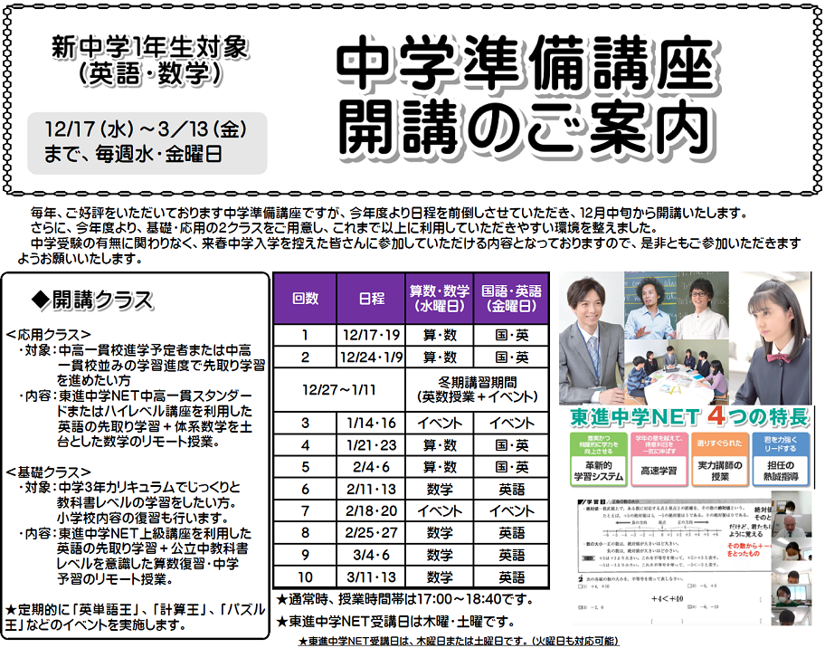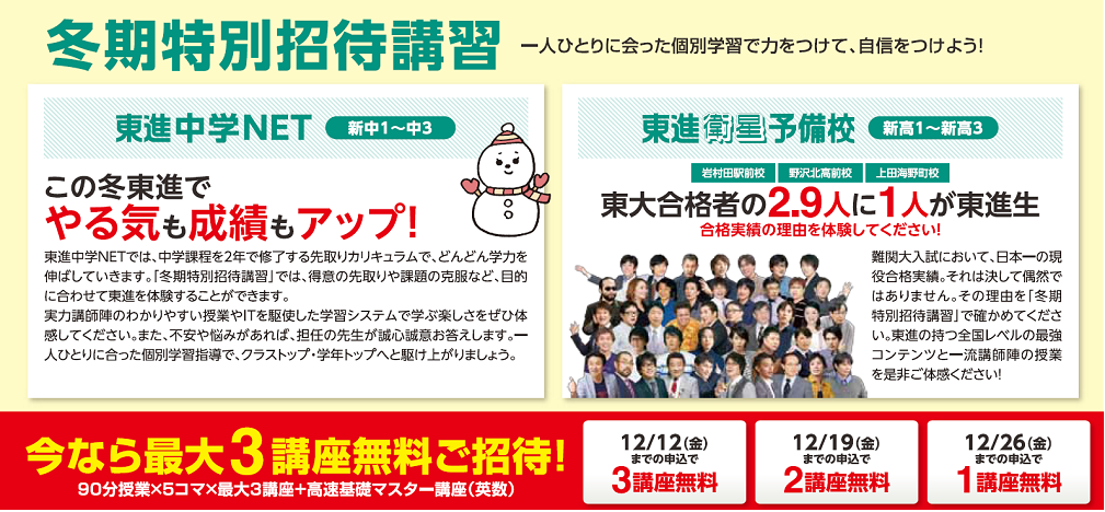 東進中学NET冬期特別招待講習は、90分授業×6コマ×2講座+高速基礎マスター講座(英単語・計算演習)が無料受講できる絶好の機会です。